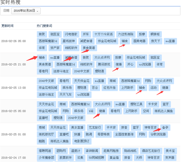 行為詞:行為詞的轉(zhuǎn)換率極高,開發(fā)者在選擇行為詞時,可以利用ASO114的實時熱搜,實時熱搜榜單變化是因用戶某一時間內(nèi)的搜索頻次而變化的,代表在某個時間段內(nèi)用戶在大量搜索榜單上的關(guān)鍵詞。個人喜歡挑選出現(xiàn)在榜單上的行為詞。如圖中標(biāo)示出來一些出現(xiàn)頻次較記的行為詞。如果我的APP是一款菜譜類APP,那么,我便會把健康、輔食、減肥、美容等做為關(guān)鍵詞。